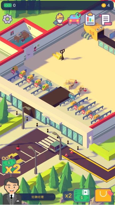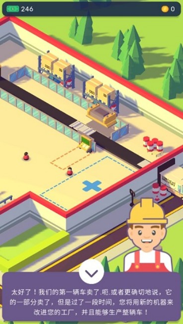 游戏前期设有新手教程引导玩家熟悉操作,过程十分简单,这里就不再赘述了。完成新手引导后,工人们就会进入车间开始工作,就像图里展示的那样,工人们在流水线上忙碌不停。只要持续经营,工厂生产的产品会自动运到市场售卖。随着时间推进,后续还能解锁新机器来升级工厂,最终甚至可以生产出完整的汽车。