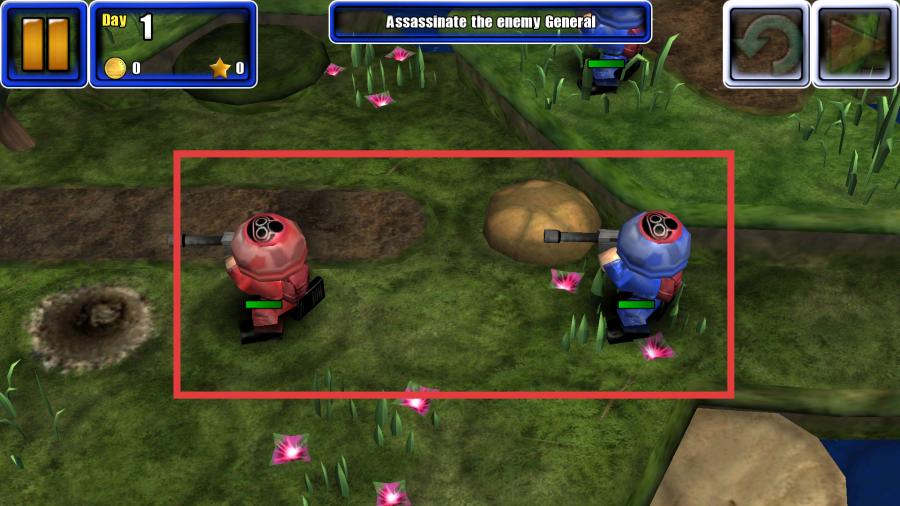 4、进入游戏战斗界面后,界面会显示Day1和当前任务,玩家需要操控蓝色士兵角色,借助场景里的地形等元素,对敌方红色士兵展开攻击,以此推动任务进度。