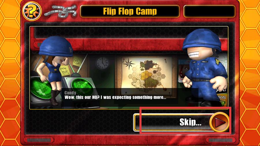 3、进入游戏场景加载界面后,界面展示了场景,有穿着蓝色军装的卡通人物对话,点击Skip按钮,跳过对话,进入游戏战斗界面。