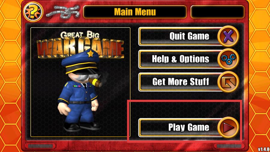1、启动《伟大的战争》进入主菜单界面,该界面设有若干选项,还呈现着身着蓝色军装、嘴里叼着雪茄的卡通人物形象,点击“Play Game”选项后,即可进入游戏类型选择界面。