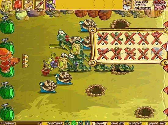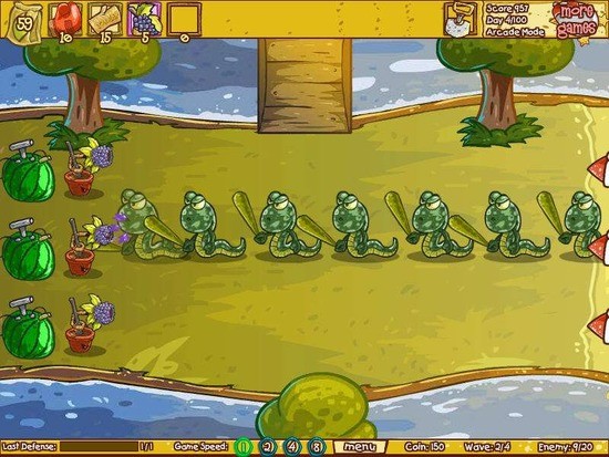 在这款游戏中,玩家需要种植各类水果来对抗害虫,不同品种的水果其攻击方式存在些许差异,玩家需在多个关卡中完成消灭害虫的任务。
