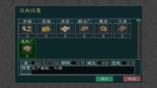 通过都市可进行市场、农场、兵舍、锻造厂、厩舍等设施建造,其中: