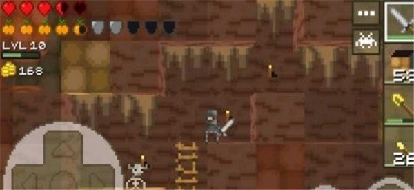 2、屏幕左下角设有控制移动的虚拟摇杆,你可以通过它操控角色移动并向前探险;右下角的A键为跳跃键,连续点击两次即可触发两段跳,B键则是攻击键。在探险途中,你需要借助跳跃、潜水和挖掘等动作来保护自己。