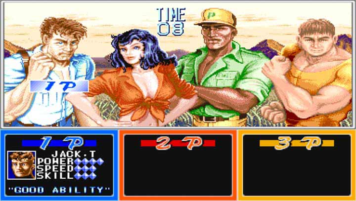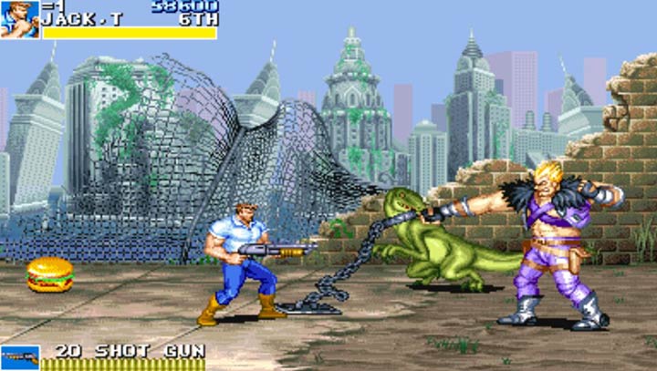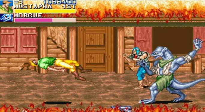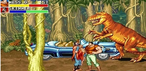 《恐龙快打》(Cadillacs and Dinosaurs)由日本CAPCOM公司推出,改编自1993年美国CBS播出的《Xenozoic Tales》,以“恐龙”这一经典商业题材吸引玩家。故事背景设定在26世纪,彼时恐龙与人类共同生活。这部作品里,道具的功能性被大幅增强:所有武器类道具都带有弹药限制,弹药耗尽后就只能当作一次性投掷道具使用,玩家甚至能夺取Boss的武器进行反击;木桶这类容器道具也不再只是被砸破获取物品的存在,还可以被举起投掷出去。此外,《恐龙快打》延续了Capcom一贯的多样攻击方式,游戏中还有不少趣味十足的Bug,堪称一部保持了高水准的动作热斗佳作。