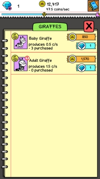1、为购买长颈鹿打好基础:先动用初始金币或者前期攒下的金币,在商店里挑选购买基础品种的长颈鹿,购买的数量可以依据当前的金币储备来灵活调整,要保证至少拥有两只同一品种的长颈鹿。