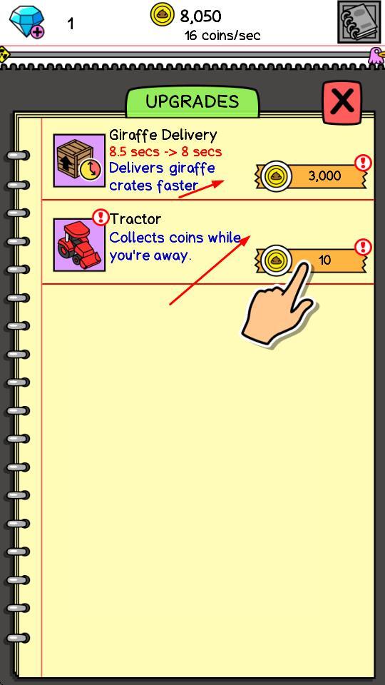3、进入升级界面,可升级长颈鹿交付速度,让木箱送达更快,还能解锁拖拉机,离线时也能自动收集金币。