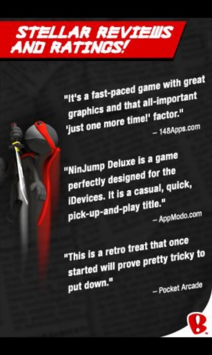 《跳跃忍者 豪华版(NinJump Deluxe)》这款超棒的应用程序现在可以免费获取啦!这个版本包含3个等级关卡,能让您的忍者向上攀爬跳跃的乐趣更上一层楼,也会进一步考验您的敏捷反应能力哦。