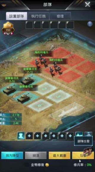 3、科学分配资源与兵种,规划战术方案,于地图中选定目标展开进攻与防御。