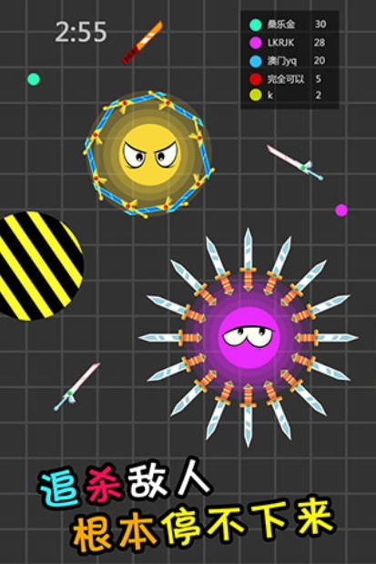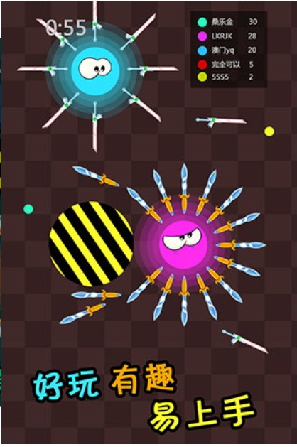 《刀剑英雄大作战》是一款以休闲飞刀为核心的小游戏,玩法简洁易懂:玩家只需用手指点击屏幕,即可操控画面里的小球。游戏中,你需要躲避或防御其他小球的攻击,同时拾取地面上散落的各类武器;挑战时,优先选择地图上防御力较低的敌人发起对决,这样既能提高获胜概率,还能提升自己在排行榜上的名次。 游戏看似操作简单,实则蕴含着需要极限操作的精彩竞技内容——一击致命的机制,能让操作顶尖的玩家轻松制霸全场。过程中,你既要升级自身属性、追求极限战力,也要通过魔性十足的对决逐步进化;它延续了“大鱼吃小鱼”的基础规则,玩家可通过吞噬其他小球实现成长,同时还得不断走位,竭力避开敌人周围环绕的武器。