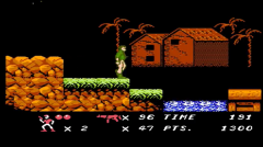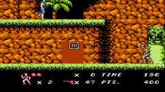 操作方式:使用方向键控制角色移动,上键进入暗室,下键蹲下躲避子弹;按 A 键跳跃,按 B 键射击;还可使用组合键上 + A 实现高跳,或下 + A 下落至下一层。