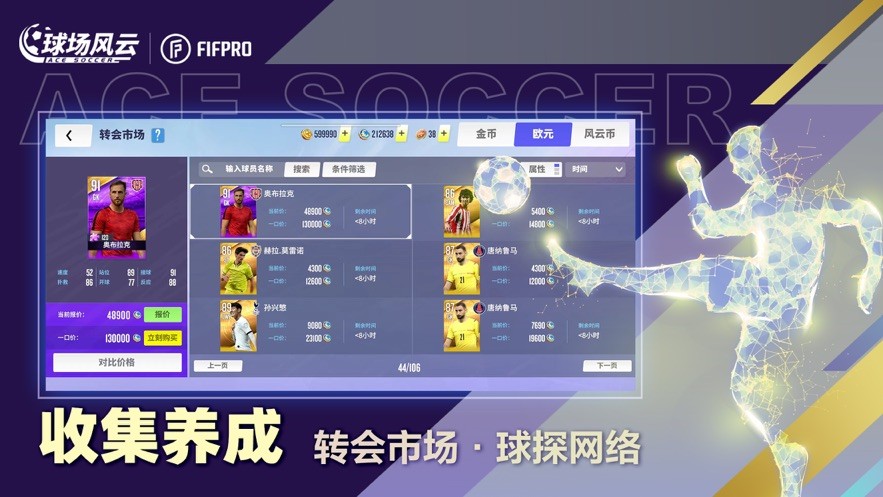 游戏拥有英超、西甲、法甲、意甲等54个国家及联赛、超过6万名真实球员IP授权。