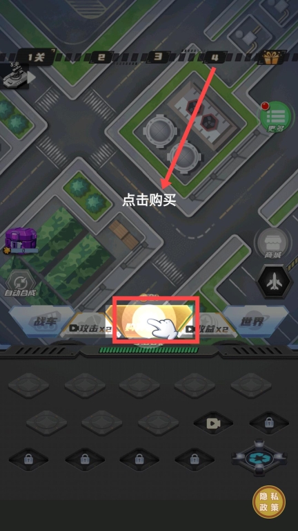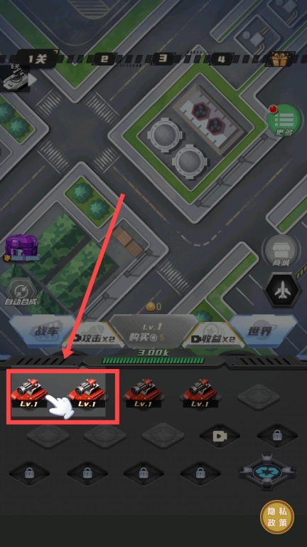 3、购买后,点击下方坦克,拖动合成或部署,强化战车攻击能力,助力通关,推进游戏进程。