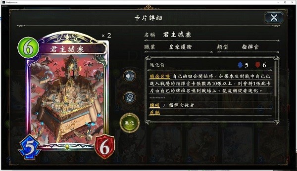 城塞(小区)皇这套卡组的核心运营围绕君主城塞展开,君主城塞属于任务类卡牌,当场上进入战场的指挥官累计达到10张时,就能从卡组中瞬念召唤它。这张卡的本体效果为【操纵】,进化后拥有疾驰和双击能力,身材是5-6,搭配卡组里的增益卡牌可以实现OTK。