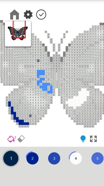 像素风格的图片里,每一个像素都配有对应的颜色标识和数字提示,还提供了颜料桶这类能一键给多个区域涂色的工具。完成涂色的图片,用户都可以进行保存或者分享操作。