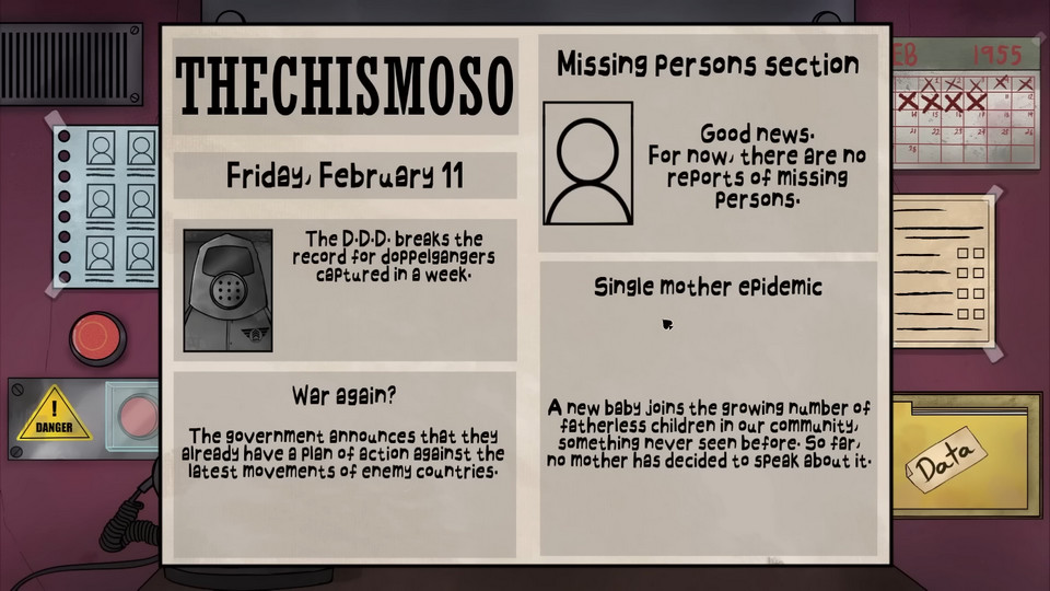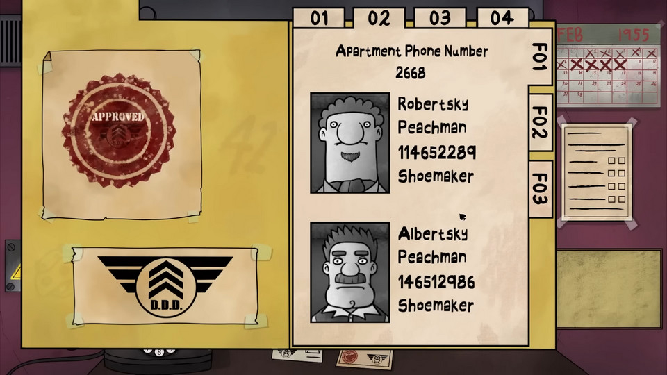 故事设定在1955年,不知为何,伪人的活动变得格外频繁——它们能完美模仿人类的样貌,一心想要潜入人类社会。为了应对这一危机,替身侦测局(D.D.D.)随即启动了专项行动。而玩家将以新任门卫的身份加入该局,主要负责核查公寓进出人员的身份。这份工作表面上看似轻松简单,实则暗藏重重危险,稍有疏忽,就可能让伪人趁机入侵,进而威胁到整栋公寓居民的生命安全。因此,玩家必须对每个细节都保持高度警惕,通过一步步的探索,逐渐揭开伪人现象背后隐藏的真相。