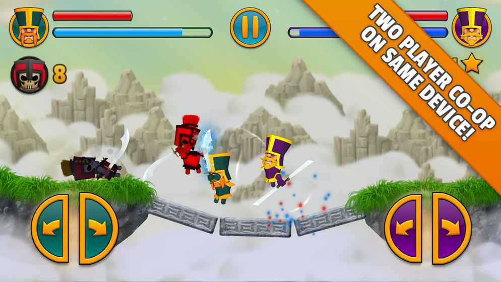 云端骑士的操控方式和我们常见的不太一样,没有前进、后退、跳跃这三种常规操作。他们唯一能做的,就是用手中的武器持续朝左或朝右挥动。而这种挥动动作,除了用来斩杀敌人外,更重要的作用是借助攻击敌人产生的反作用力,让自己能攀升到一定高度来避开危险——这本质上是把武器当作杠杆在使用。另外,云端还会持续掉落宝箱之类的物品,这些东西自然也能成为骑士们向上跃起的垫脚石。