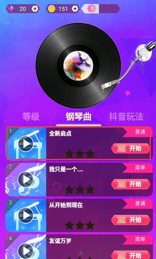1、打开游戏先挑首歌,流行、摇滚啥风格都有,想听哪个点哪个。