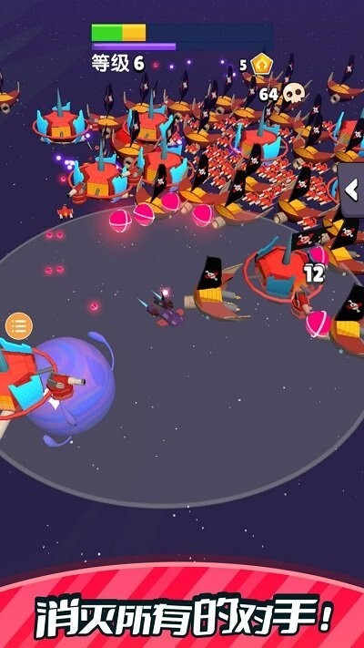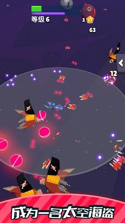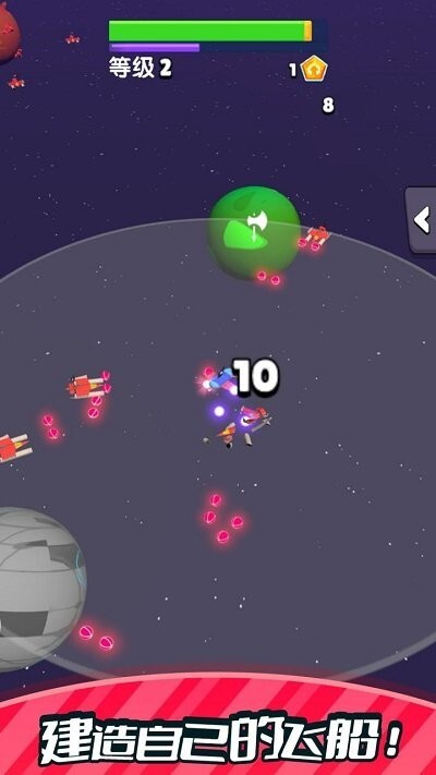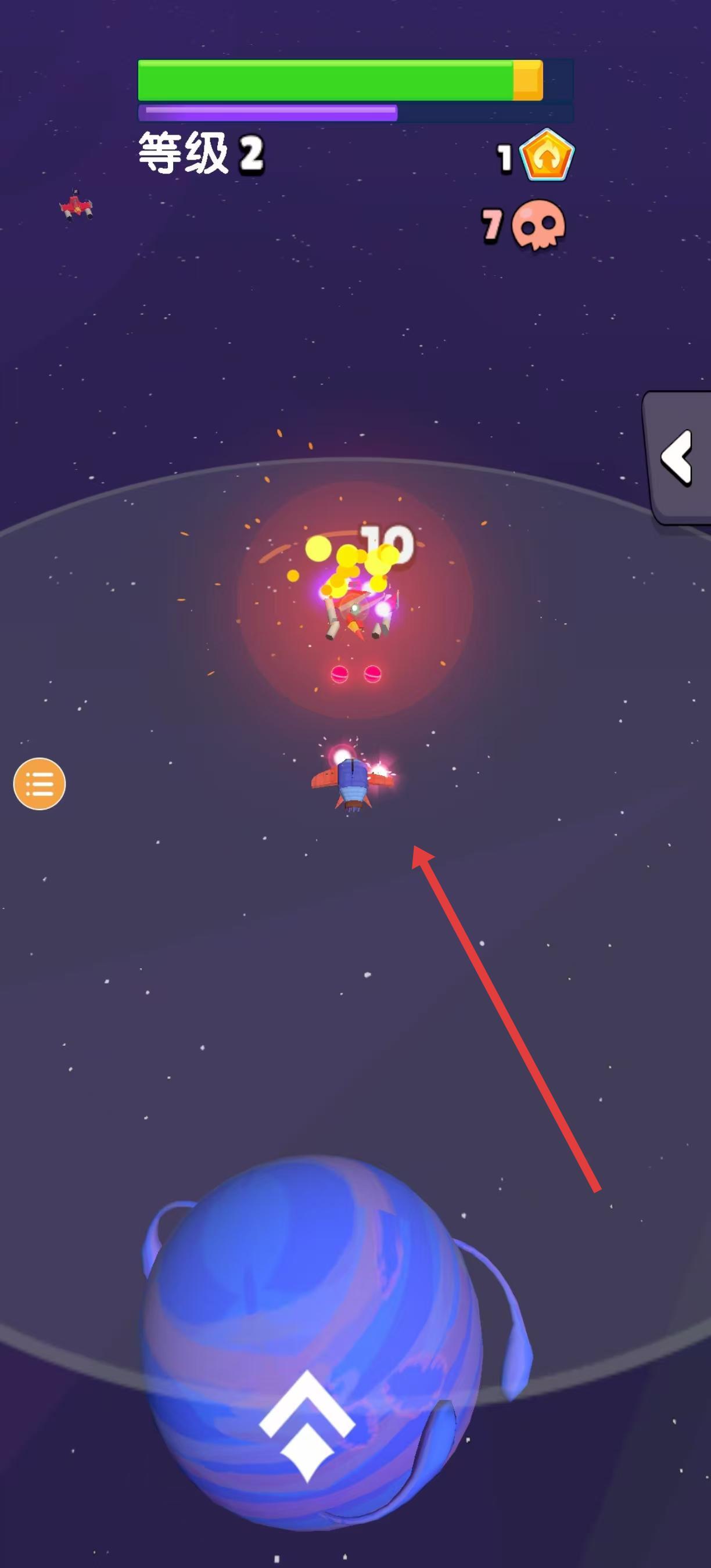 3、操控飞船在星际空间飞行,躲避障碍,攻击红色敌机,借助技能效果,让飞船在战斗中持续推进,完成冒险任务。
