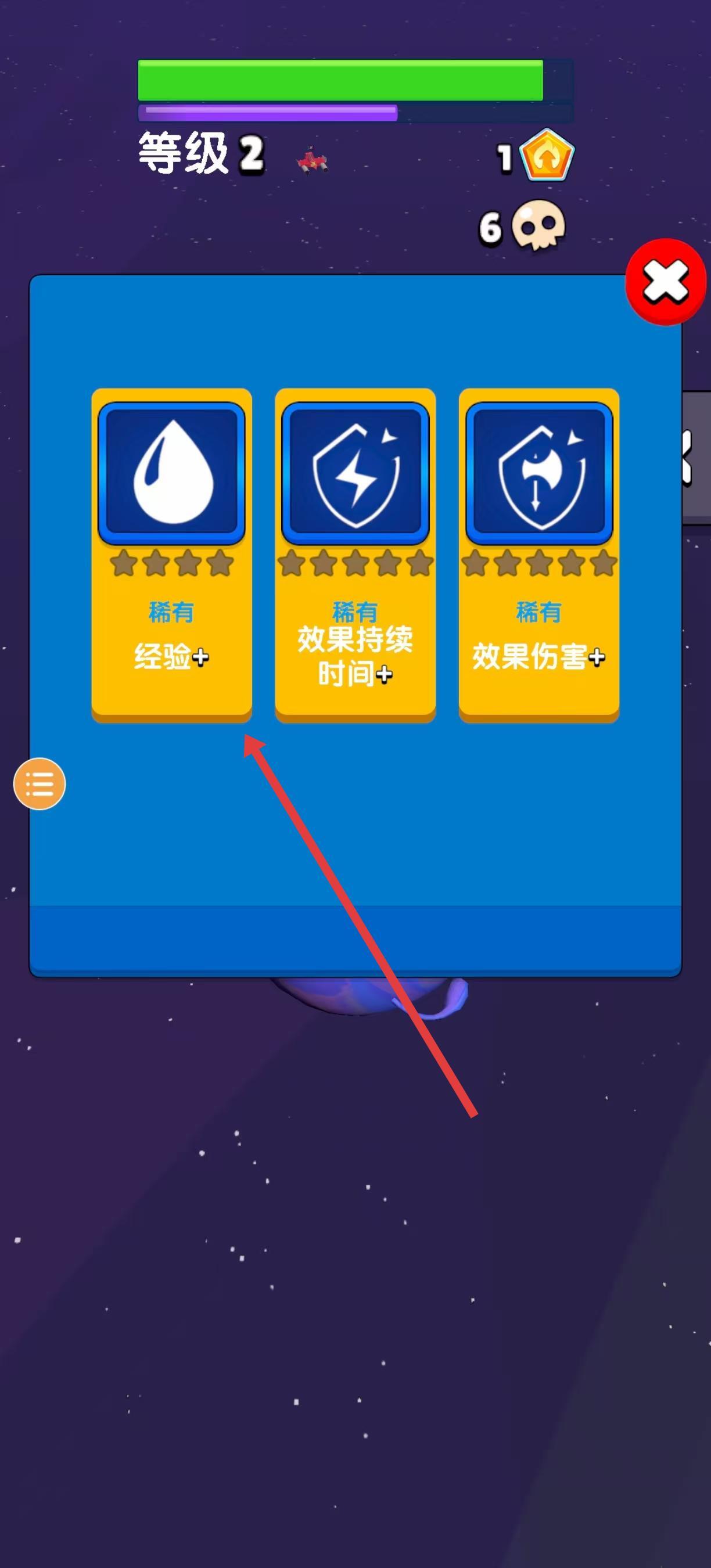 2、飞船升级到等级2,出现稀有技能选择界面,点击经验技能卡牌,为飞船添加经验增益效果,提升成长速度。