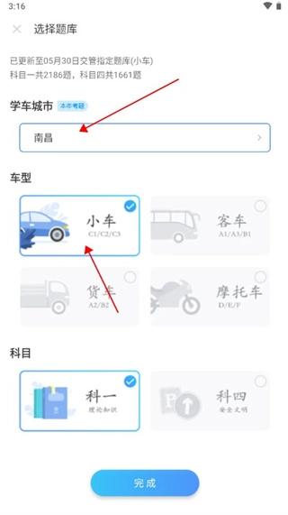 1、安装该软件,在手机上打开软件,选择自己所在城市、驾照类型、选择想要练习科目;
