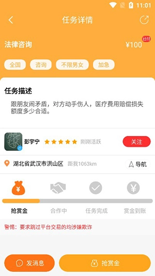 3、小编选择一个任务之后,可以选择发送消息以及抢赏金