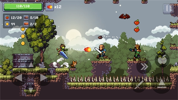 3、当面对高处或空中的敌人时,点击【跳】按钮可以跃起躲避攻击,与此同时还能收集空中的苹果资源,从而提升续航能力。
