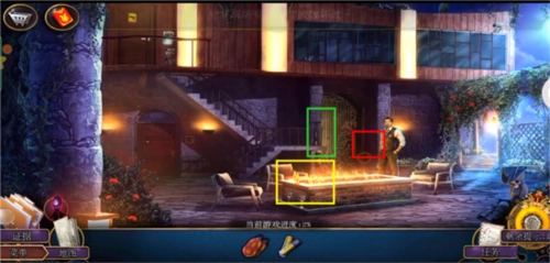 4、进入屋子后先进行对话。随后直接点击右上角前往后院。在后院里,先点击中间的侦探,获取红框中的照相机;接着点击黄框放大区域,得到剪枝钳;再点击绿框放大区域,拿到门左侧的抽气泵;最后点击灰框位置,使用刚得到的照相机拍摄以留存证据,即可完成教程。