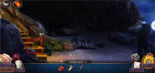 5、再次点击之前拍照的地方前往悬崖,边上红框处的台阶上有一个标志,点击放大后得到百合花象征物。