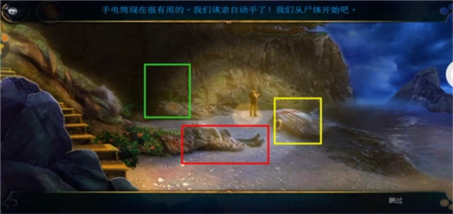 7、返回悬崖边,在阴影区域使用手电筒。先点击红框位置放大画面,对尸体使用照相机留存证据。接着点击尸体头部的布将其移开,再对尸体脸部用照相机记录证据。之后点击尸体手上的手表获取证据,随后掀开尸体身上的衣服,找到钱包并获取里面的密码图案。然后点击黄框处的小船放大画面,移开救生圈后,在小船左侧有绳子的地方使用充气浮标,再用打气筒(抽气泵)操作,多次点击小船后得到马克的钱包,阅读里面的纸条获取线索。最后点击钱包左侧,得到卡片。再点击绿框位置放大画面,使用剪枝钳,获取里面的第二个金字塔碎片
