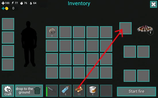 制作完成后,火堆就存放在我们的背包里了,我们需要按住它并拖动到下方的道具栏中。