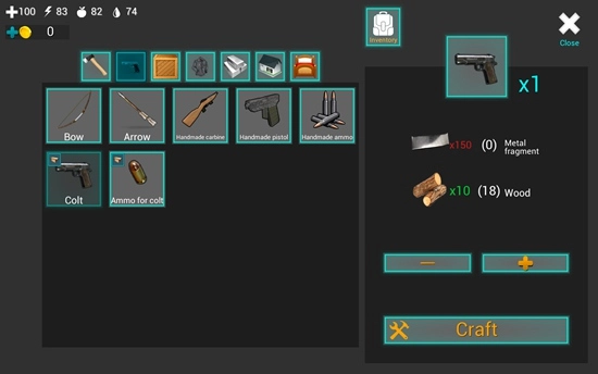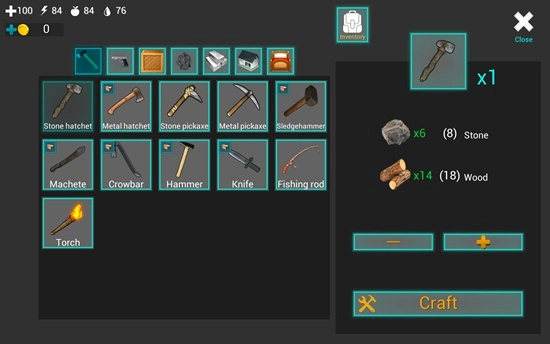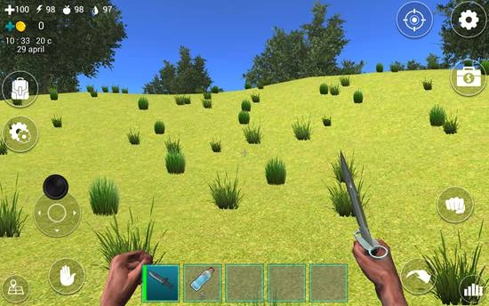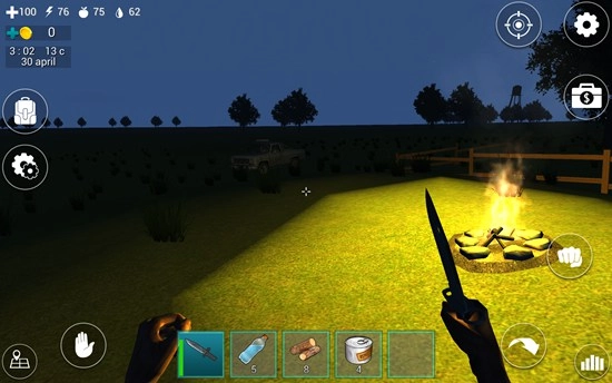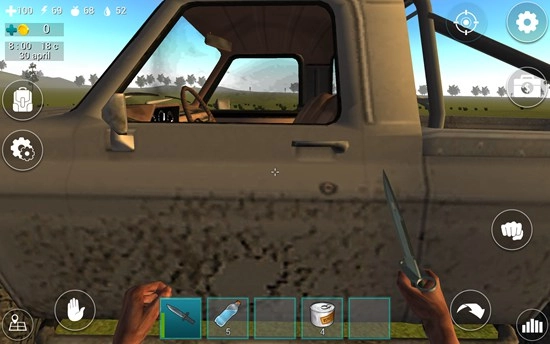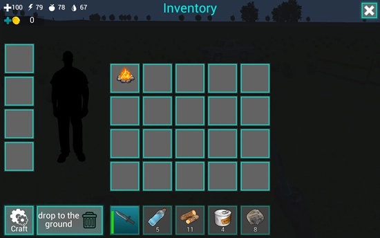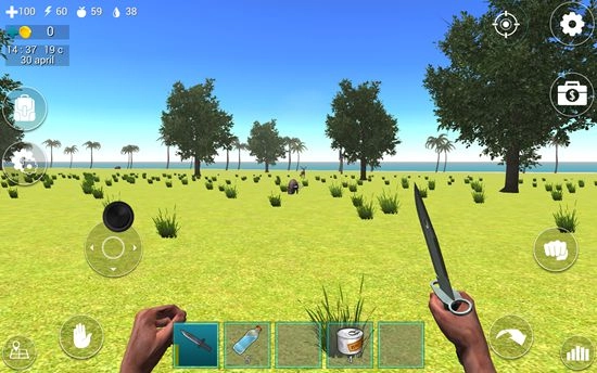 屏幕下方的道具栏里放着一把匕首,只要点击它就能把匕首握在手里。屏幕左上角的四个带数字的图标,各自代表着血量、体力值、饥饿值和口渴值。