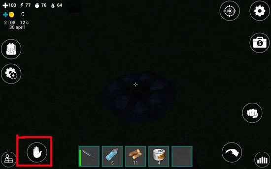火堆摆放妥当后并不会自行燃烧,我们需要对准火堆,点击屏幕左下角的“手掌”图标来点燃它。