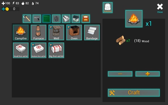 不过现在我们首先要做的依然是生一堆火,生这堆火需要7根木头,点击火堆的图标,再点击右下角的“Craft”按钮,就能把它制作出来了。