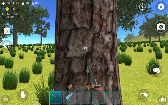 我们顺着海岸线往水塔的方向行进,途中可以用匕首对准树干,接着点击右侧的“拳头”攻击按钮,就能获取木头,这可是后期生存必不可少的材料。