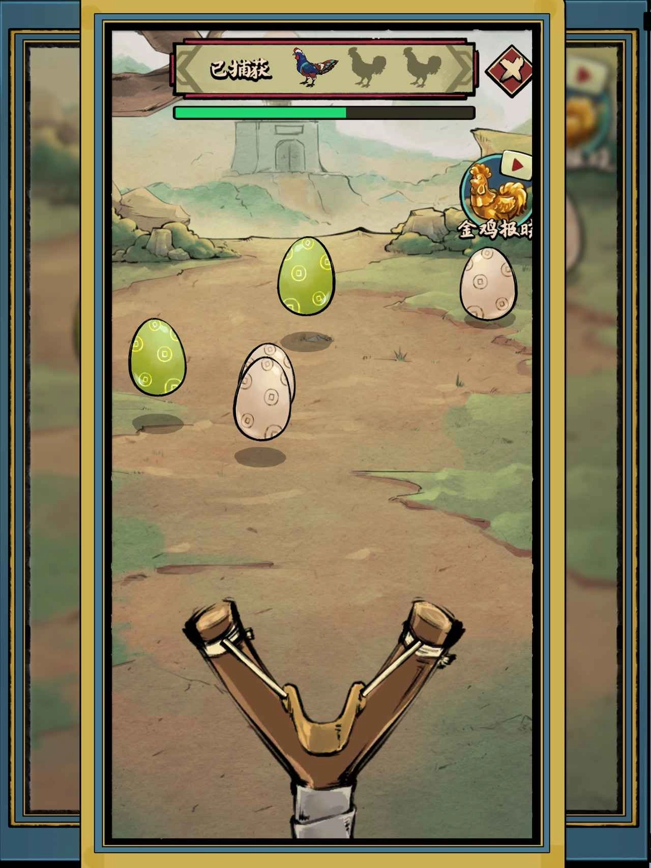 点击蛋诞山后,里面会出现新手教程,指导你怎样用弹弓射蛋。这些蛋挺神奇的,竟然还会跳,果然是“疯狂”斗鸡场啊。