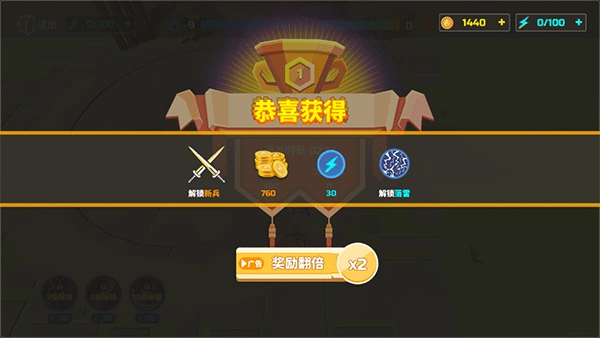 消灭所有敌方士兵就能赢得胜利,胜利后会得到奖励。玩家可以选择点击观看广告来获取双倍奖励,也可以直接领取奖励而无需观看广告。
