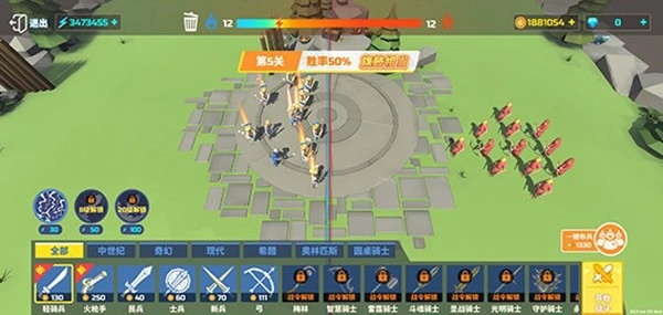 玩家能够点击下方的兵种图标,挑选希望出战的兵种,接着点击竞技场,士兵便会自动生成。