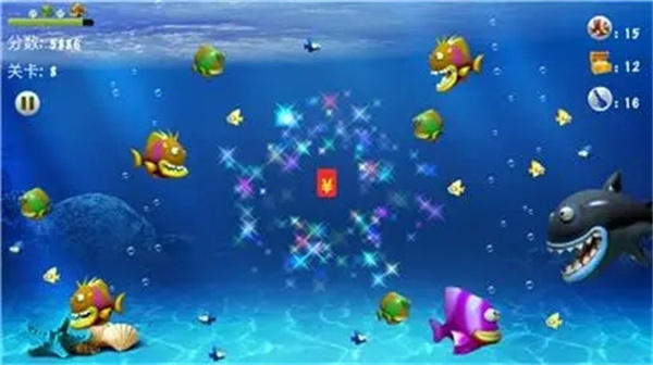 【第1—3关】珍珠港的狂欢,要小心海底的水母,太靠近漂亮的事物可能会让自己受伤。场景里的漂浮道具有星星、鱼头和加速。需要注意的是,这片水域总共有4种鱼,其中体型最大的那种是不能吞食的,避开它就行。另外还有水母,同样无法吞食,一旦接触会产生眩晕效果。
