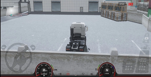 点击右上角的菜单按钮,接着点击左侧的钥匙图标来启动卡车,之后就能通过踏板进行操作了。其中,方向盘是操作的坐标,右侧分布着刹车和油门踏板,而油门上方则是前进挡和倒挡的切换区域。
