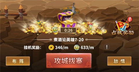 我们按照引导完成布阵与挑战后,会明白一个要点:游戏前期,武将等级起着关键作用,想要挑战关卡就必须提升武将等级。升级武将需要用到铜钱和武将经验这两种资源,它们主要来自于挂机奖励(可在出战界面查看获取)。