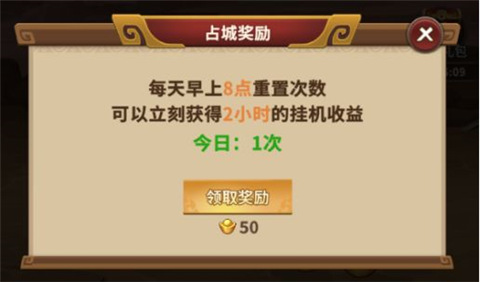 想要快速拿到挂机奖励的话,可以这样操作:打开占城奖励(位置在出战界面里挂机奖励的右侧),每天能快速领取两次,第一次是免费的,第二次需要消耗50元宝。VIP等级越高,每天能快速领取的次数就越多,并且每次额外领取的花费都是50元宝。这里就先不展开细说了,有需要了解更多的朋友可以自己去查看相关内容。