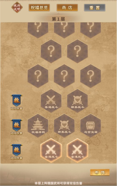 西域远征设有32层关卡,玩家需挑选一条路线进行挑战。值得注意的是,武将的血量在各层中是通用的,这一设定的优势在于玩家能够随时对阵容进行调整。在挑战过程里,玩家可自主选择普通难度或精英难度;若担心挑战失败,还能通过选择宝箱或其他加成道具来强化自身实力。参与西域远征,玩家可以获取远征币以及其他各类资源,不过该玩法每天仅能挑战一次。