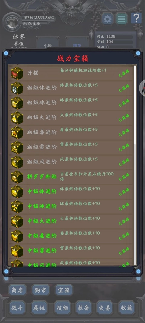 现在开局只要刷E50战力,宝箱选开摆就行,每分钟随机加1阶。前期主肉打到12觉,换毒系凑一套狗币套装(1速3狗6币)刷狗币,等血刀功法攒到一两百阶。再刷套10级高级连击,就能离线靠血刀的离线收益涨战力了。之后打707boss拿25万轮回点,开轮回之子宝箱直接飞升,还能顺便完成终极成就,这就是最轻松的0飞攻略。