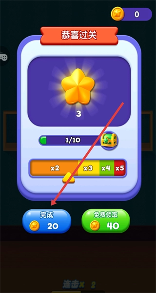 玩家完成关卡后,点击“完成”按钮就能获得基础金币奖励,之后可以用这些金币兑换道具,通过积累资源解锁更多道具,从而快速推进关卡进度。