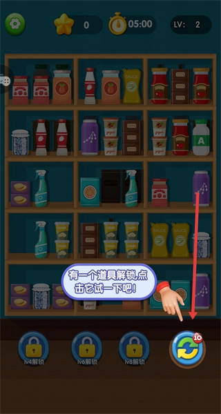关卡遇到卡点时,点击右下角的道具就能触发提示或重置货柜布局,借助道具的辅助,可以快速找到可消除的组合,突破时间限制,顺利完成挑战。