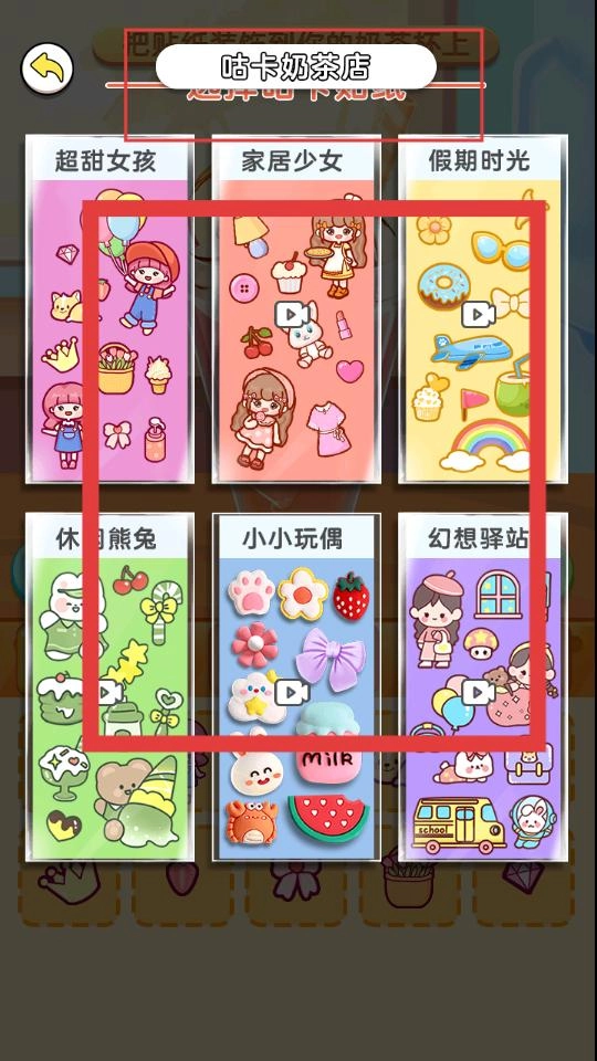 在奶茶店风格的主题界面里,挑选自己钟爱的咕卡贴纸套装,像超甜女孩、家居少女这类系列都可以,然后就可以着手进行装饰啦。