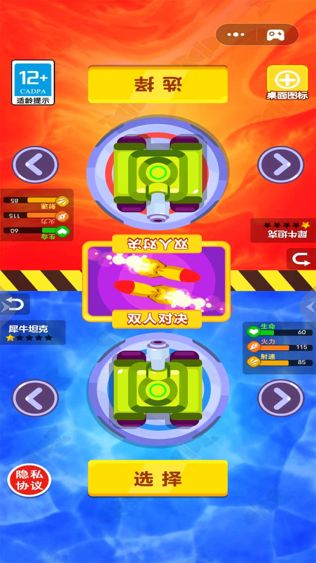 驾驶坦克对轰是一款充满激情的射击闯关游戏,这里有各式各样的坦克供您挑选,您可以自行选择心仪的坦克,并为其搭配相应的炮弹,使自己的坦克具备最强的杀伤力。在不断移动前进闯关的过程中,十分考验玩家们的操作能力,您需要找到敌人的破绽,充分发挥出自己的全部实力!