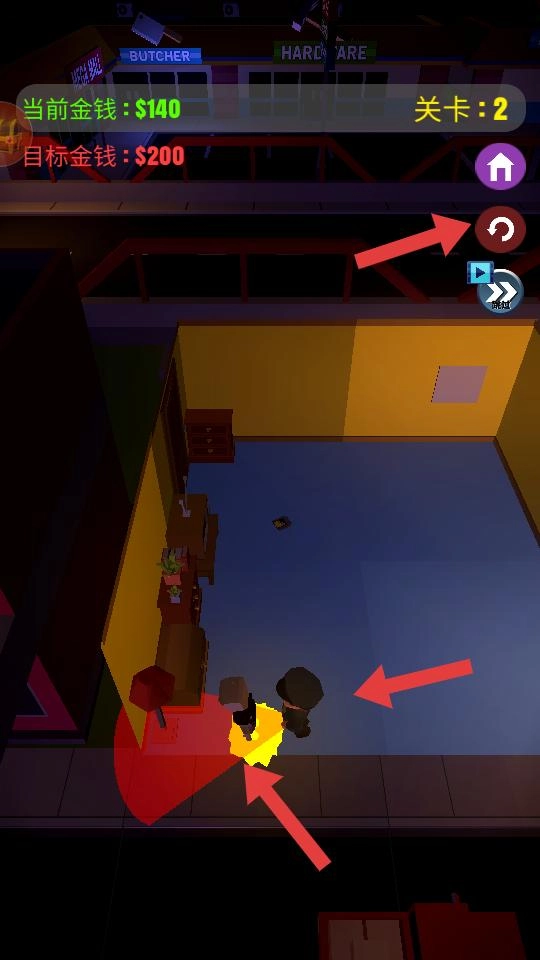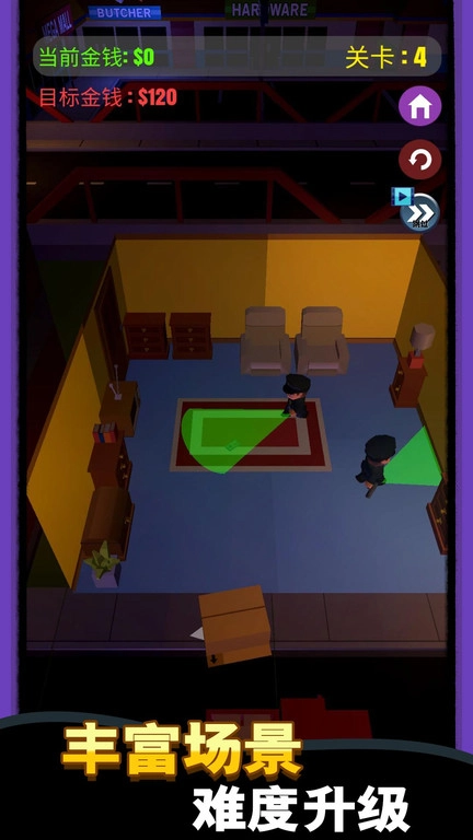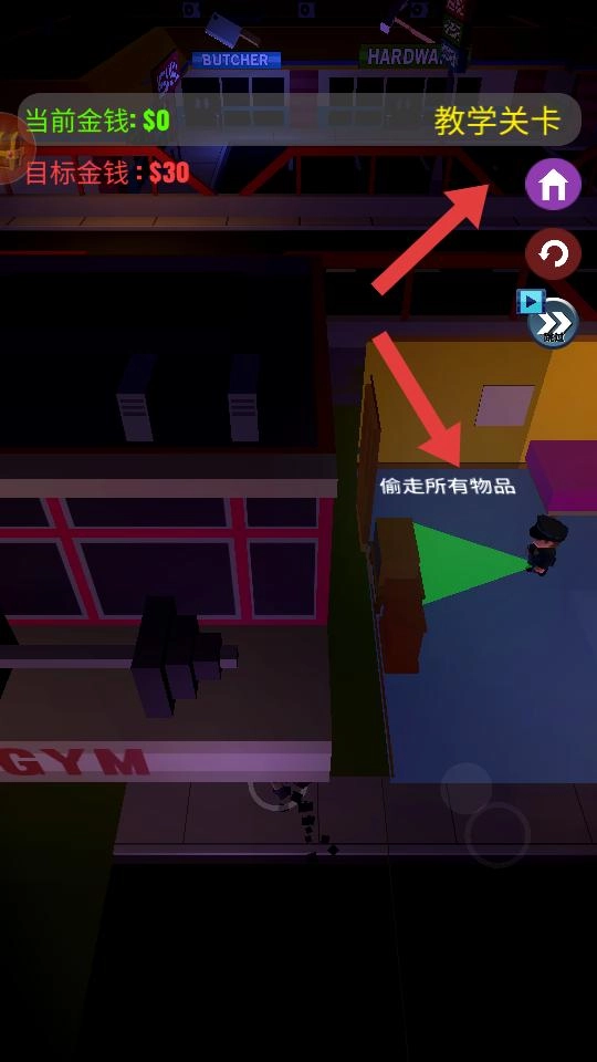 在教学关卡里,你需要依照提示把所有物品都偷走,以此完成任务,与此同时熟悉游戏的操作方式,为接下来挑战其他关卡做好准备。