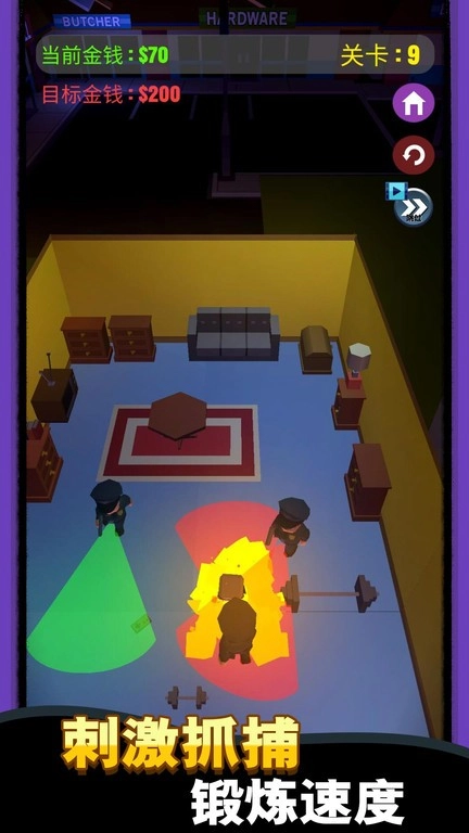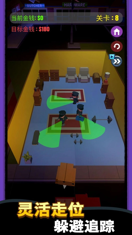 在游戏的各个关卡中,通过收集物品来赚取金钱,玩家需要朝着目标金钱数额努力,同时得留意避开危险,成功完成偷袭任务。