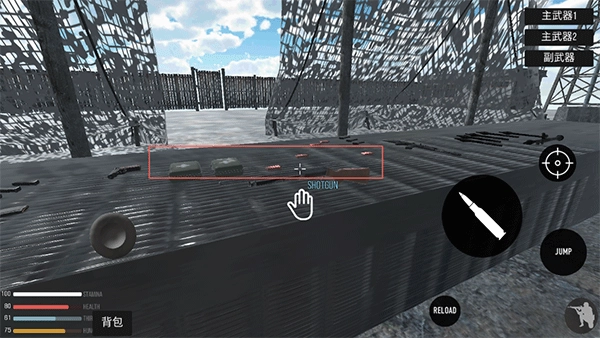 进入游戏后,能在帐篷里的桌子上找到枪支弹药,当靠近时出现手掌图标,点击即可拾取。